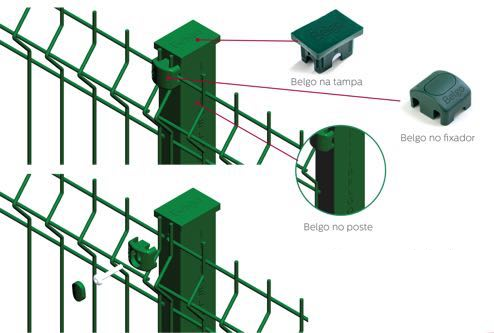 Na hora de comprar seus gradis, telas e postes, verifique se a marca da Belgo está gravada conforme as imagens: na tampa, fixador e poste. Assim, você tem a garantia de estar levando para casa produtos com a excelência que já é identidade da empresa.